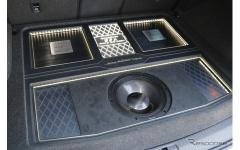 ラゲッジ後方にはサブウーファー(カロッツェリアTS-W1000RS)を1発インストールする。ラゲッジ幅いっぱいに作られたフラットスペースの中ほどに人工スエードを使ったバッフルを設置して取り付けた。プロテクション用のフロアボードには音抜けの孔を設け、ボードをかぶせて使う普段使いの状態でも確かな低音を車内に響かせることにこだわっている。