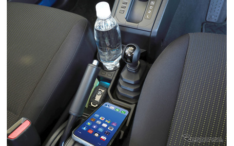 なおドリンクホルダー部は、コンビニコーヒー、細缶、太缶、600mlペットボトルまでを収納可能だ。ソフトシリコンフラップが装備されているので、ドリンクの取り出しをスムーズに行える。またスマホはローポジションに収まるのでドリンクの取り出し時に邪魔になりにくい。そしてデザインが無骨で独特なので、ジムニーのインテリアとのマッチングも上々だ。