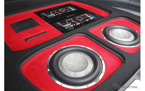 鮮烈なレッドのカラーリングをフロアパネルに採用したのは、パワーアンプにセレクトしたヘリックスのC-FOURに用いられているレッドLEDのイメージに合わせたからだ。周囲を縁取るブラックレザーとのコントラストもオーナーのお気に入り。モノトーンが主体となる各ユニットとのコンビネーションも絶妙だ。さらにラゲッジ奥にパワーアンプ2台とDSP、後方に2発のサブウーファーを配するレイアウトも含め、ユニット配置はオーナー自身がある程度プランしたという力作でもある。