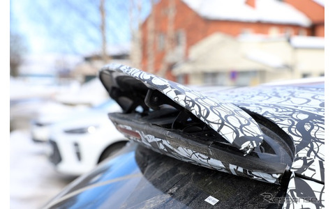 最も注目されるのは、ルーフエンドのアクティブスポイラーだ。駐車時はルーフの延長にフラットに収まるが、プロトタイプでは完全に展開された状態が撮影されている。