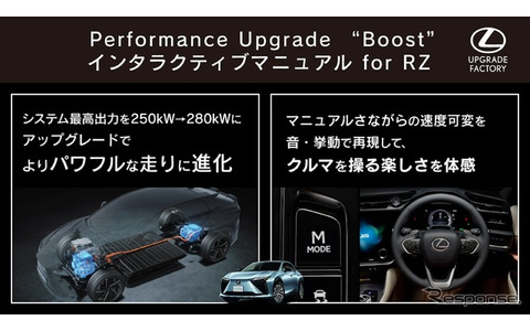 レクサス『RZ』を“純正”で後付けパワーアップ! KINTO車もOK、22万円で出力30kW向上 (2/9)自動車ニュース2026.1.4 Sun 18:00レクサス Performance Upgrade “Boost”+インタラクティブマニュアルドライブ for RZ《photo by Lexus》前の写真次の写真この写真の記事 ポスト シェア 送る 自動車