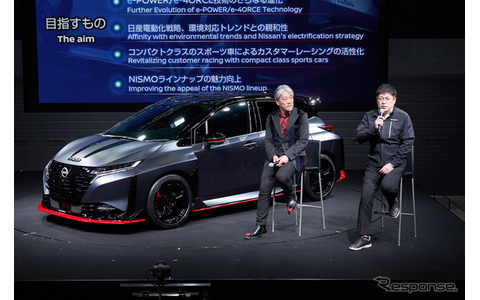 なぜ『オーラNISMO』がベースなのか? 強引にエクストレイルのe-POWERを搭載した、日産最小のスーパーカー…東京オートサロン2026 (20/20)自動車ニュース2026.1.13 Tue 18:00日産モータースポーツ&カスタマイズNISMO事業所モータースポーツパワートレイン開発部主管の片倉丈嗣さん(右)と同オーテック事業所カスタマイズデザイン部部長の森田充儀さん(左)《写真提供 日産自動車》前の写真次の写真この写真の記事 ポスト シェア 送る 自動車