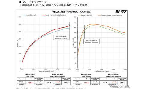 『ヴェルファイア』に吸気レスポンス向上&レーシーなサウンドを! ブリッツが車種別専用カーボンインテークシステムを発売 (3/3)カスタマイズカスタマイズ新製品情報2026.2.16 Mon 10:00パワーチェックグラフ:最大出力約16.7ps、最大トルク約13.9Nmアップを実現《写真提供 BLITZ》前の写真次の写真この写真の記事 ポスト シェア 送る チューニングパーツカスタマイズ